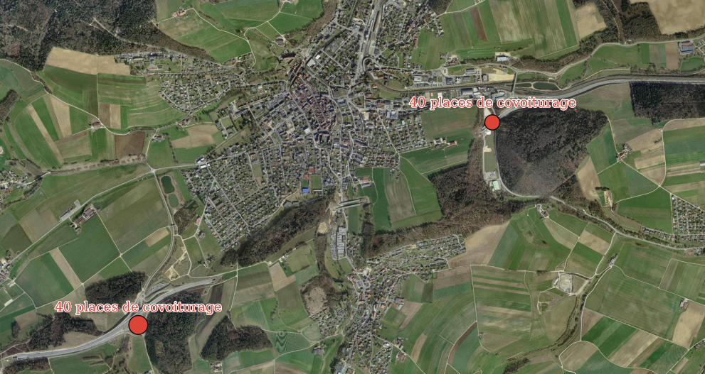 Deux aires de covoiturage à Porrentruy sont disponibles à proximité immédiate des jonctions autoroutières. L’une est située sur le site du Voyeboeuf, du côté de « Porrentruy-Est », l’autre sur celui de Mavaloz, du côté « Porrentruy-Ouest »